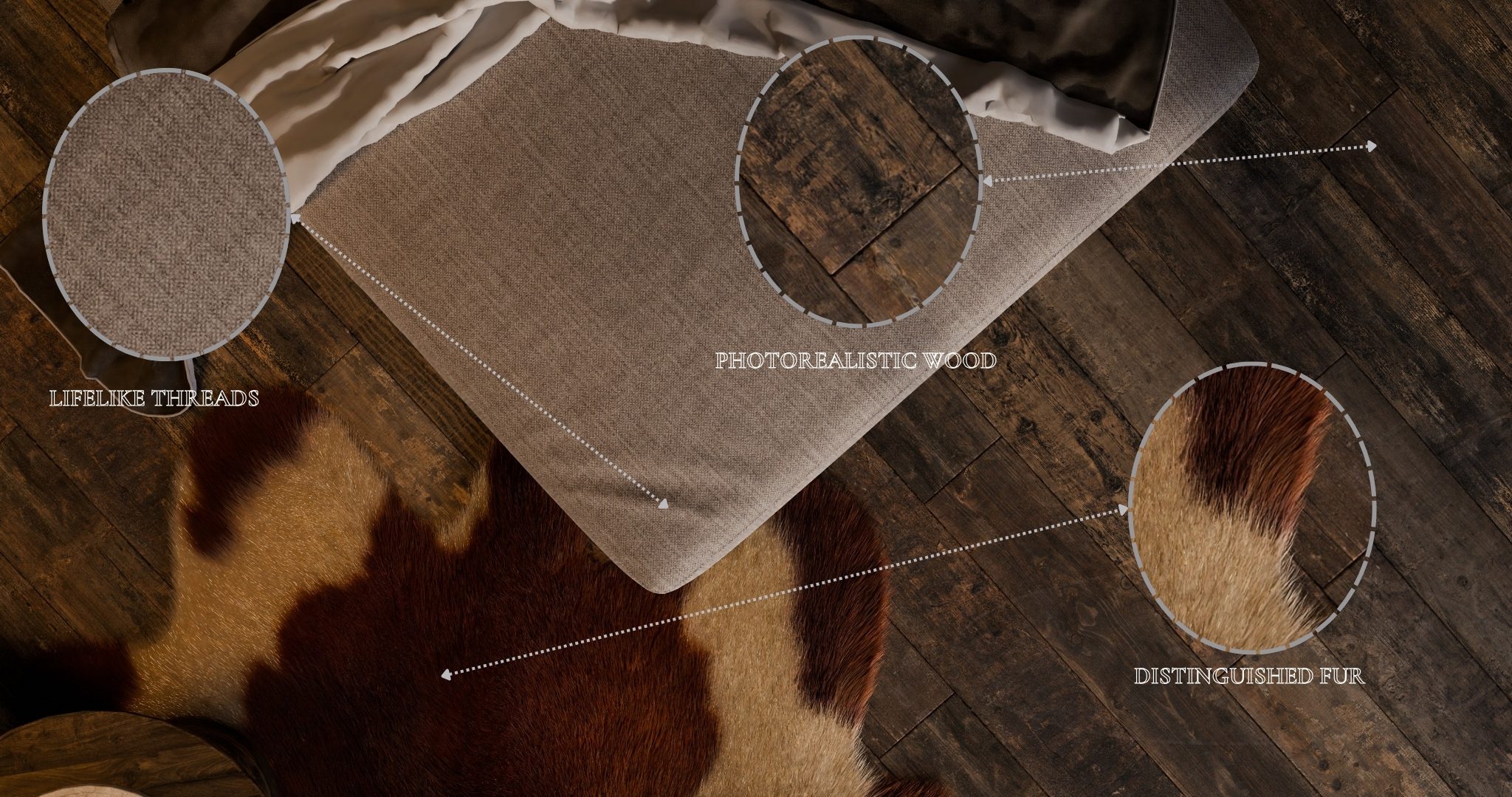 Discover photorealistic details in every thread of rugs, bedsheets, and the refined finish of wooden floors, perfect for immersive closeup shots.