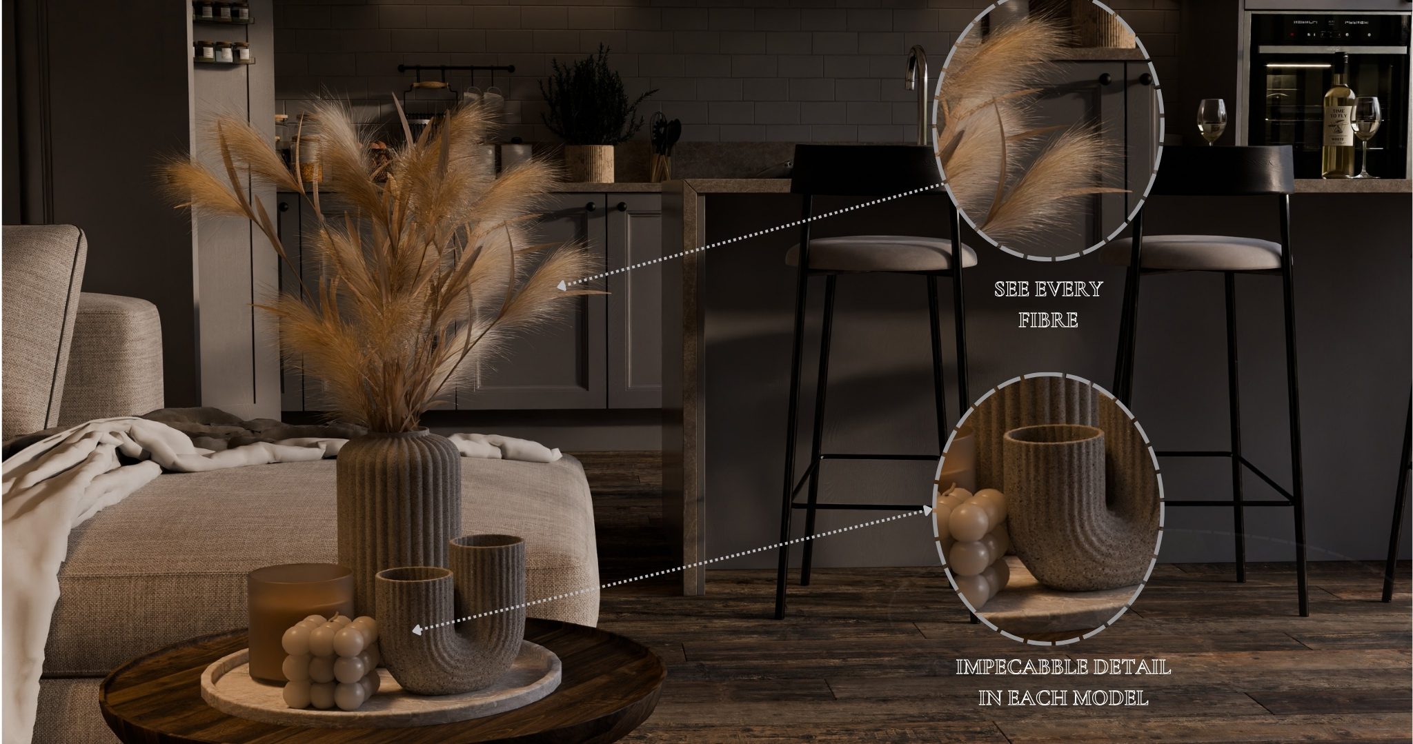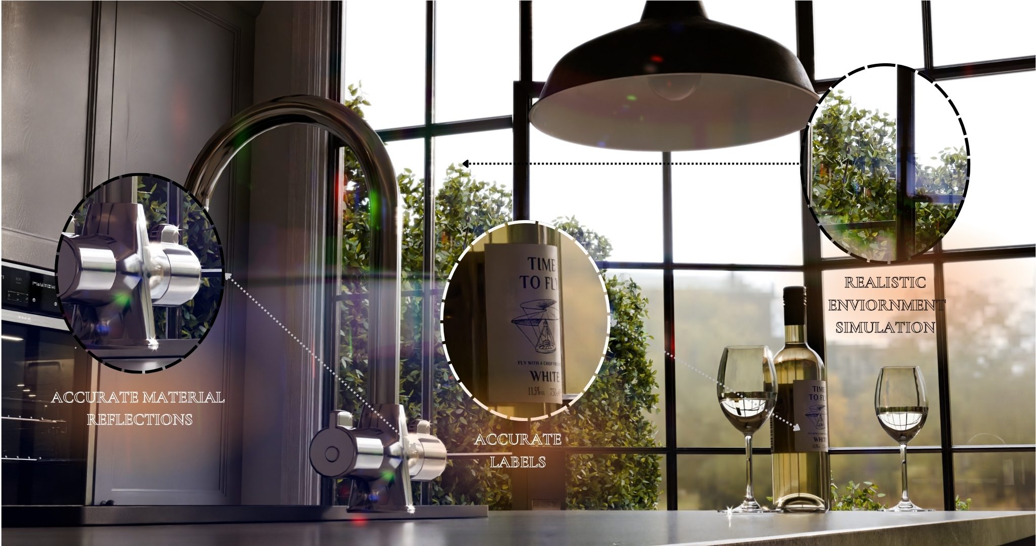 From flawless tap reflections to wine bottle labels and realistic outdoor simulations, every detail is crafted with precision.