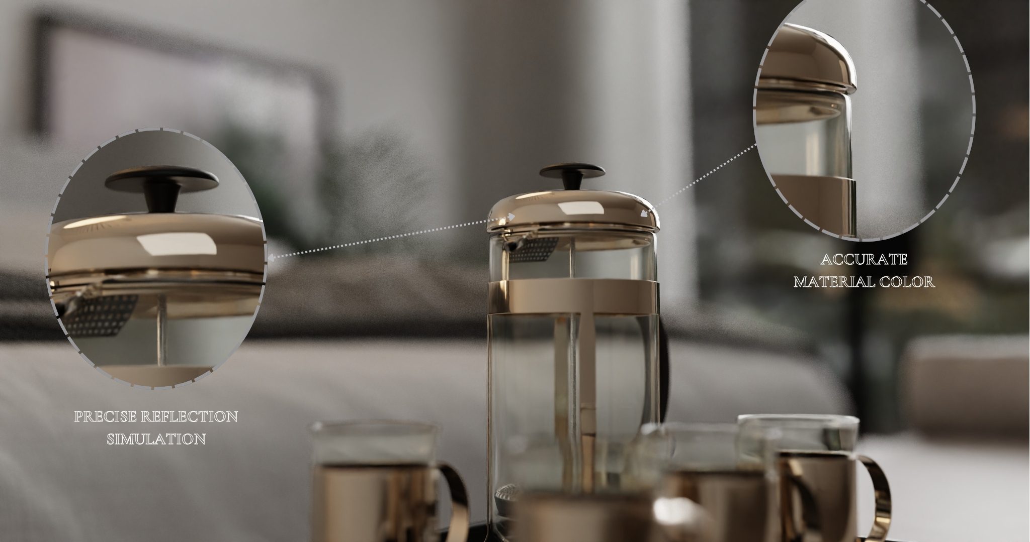 Precise reflections and perfectly rendered material colors bring objects to life, blending beauty with physical accuracy.